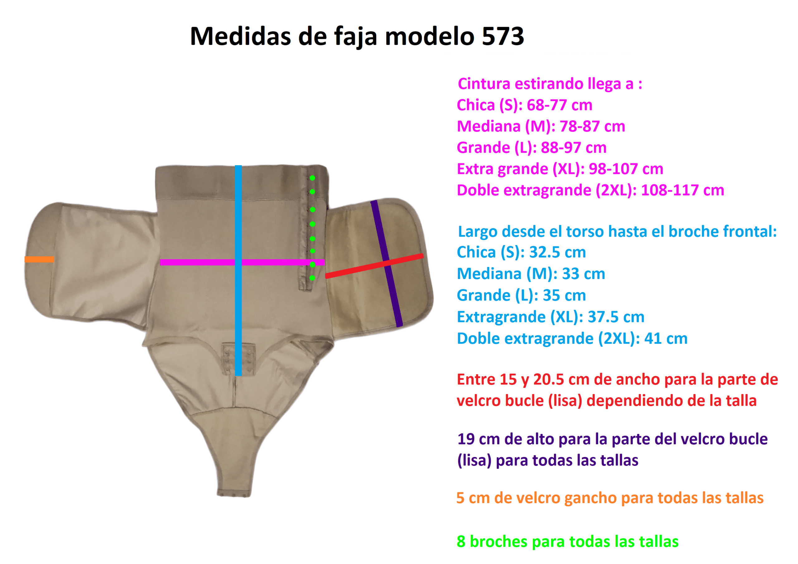 - Cuenta con la altura que abarca todo el abdomen y sus bandas laterales brindan un ajuste extra para sujetar y comprimir gradualmente.